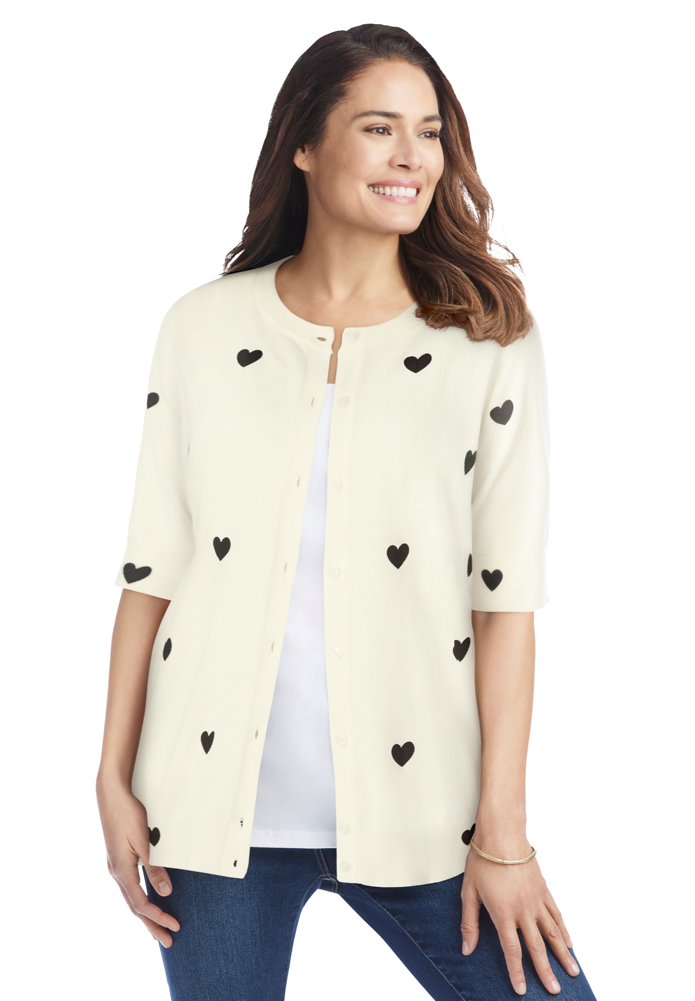 Plus Size Women's Perfect Elbow-Length Sleeve Cardigan by Woman Within in Ivory Black Heart (Size 6X) Sweater