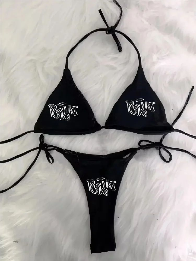 2000s Punk Y2K Gothic Rhinestone Lace Up Bikini Swimsuit black s(us 4)