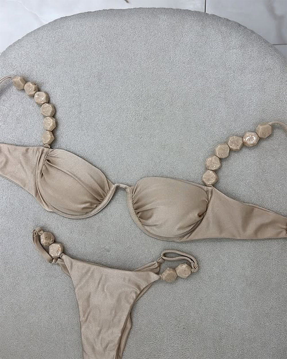Sexy Triangle Chains Bikini Set With Micro Thongs, Bandage Style Swimwear For Women Beachwear Print Thong Bikini gray s