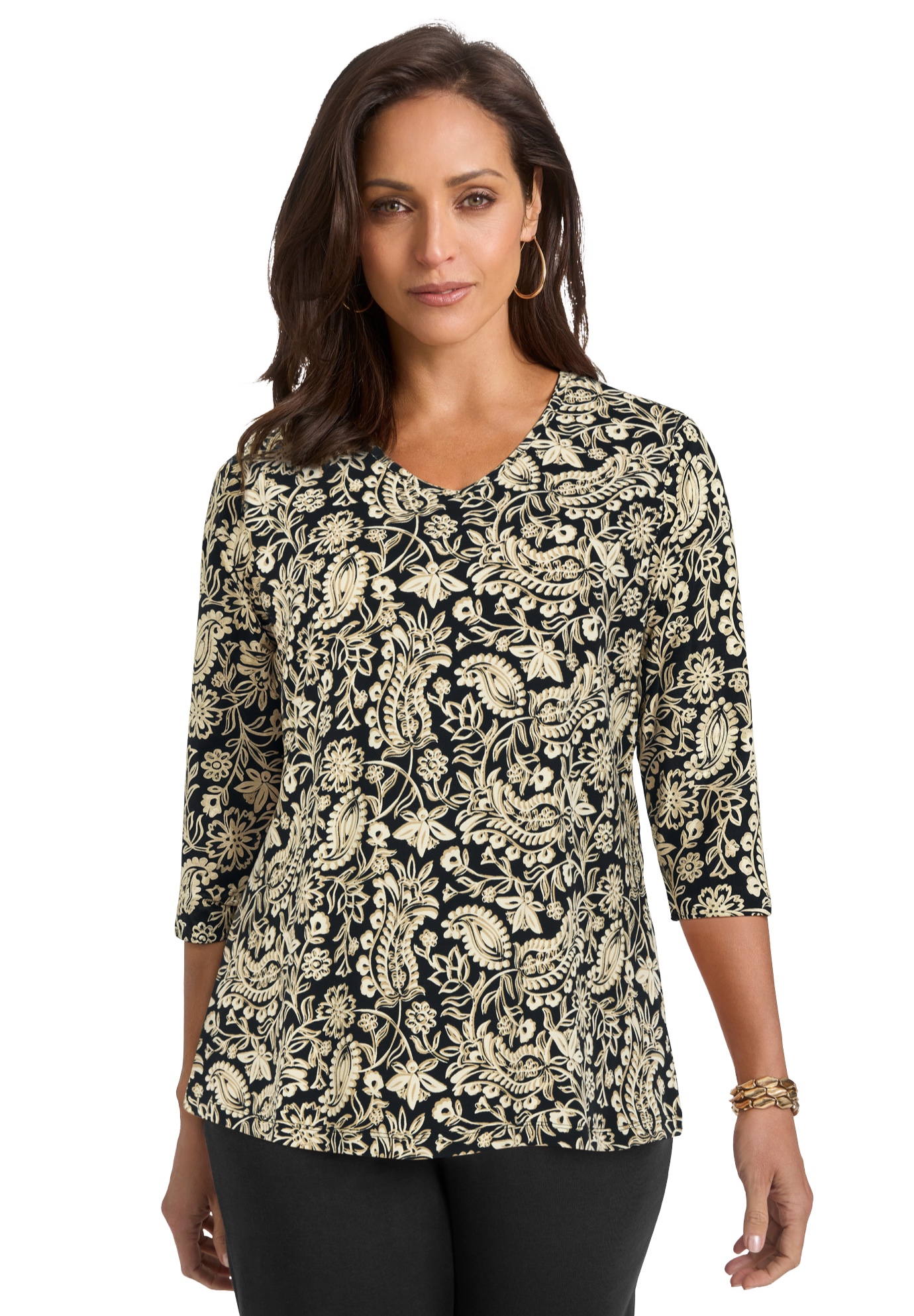 Plus Size Women's Stretch Cotton V-Neck Tee by Jessica London in Black Bold Paisley (Size 12) 3/4 Sleeve T-Shirt