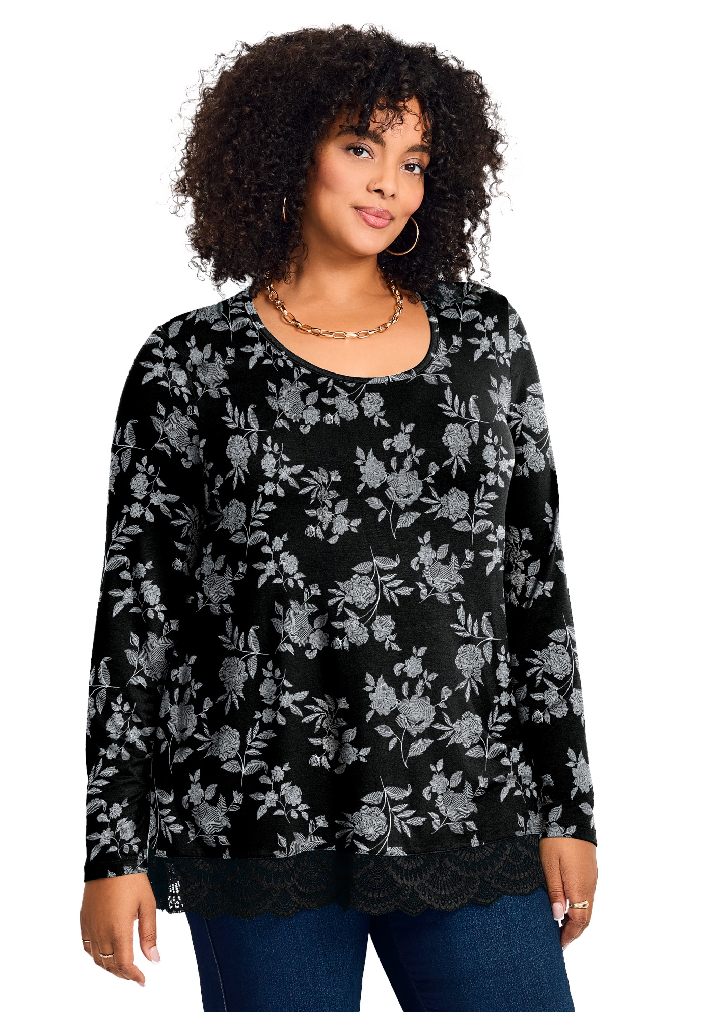 Plus Size Women's Lace Hem Crewneck Tunic by Avenue in Black Stitch Floral (Size 20)