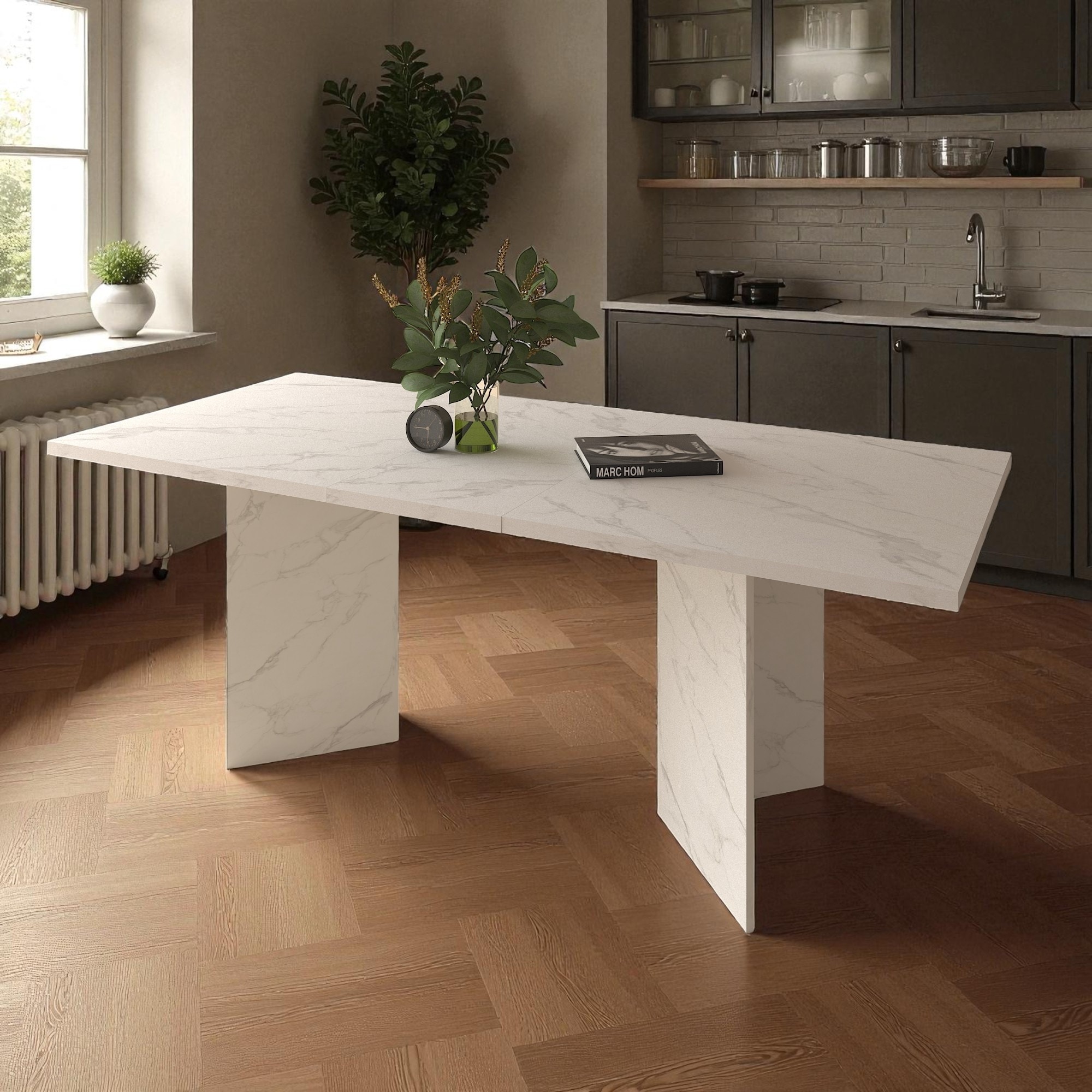 Extendable Faux Marble Dining Table for 6-10, Modern Rectangular Expandable Kitchen & Conference Table with V-Leg Base