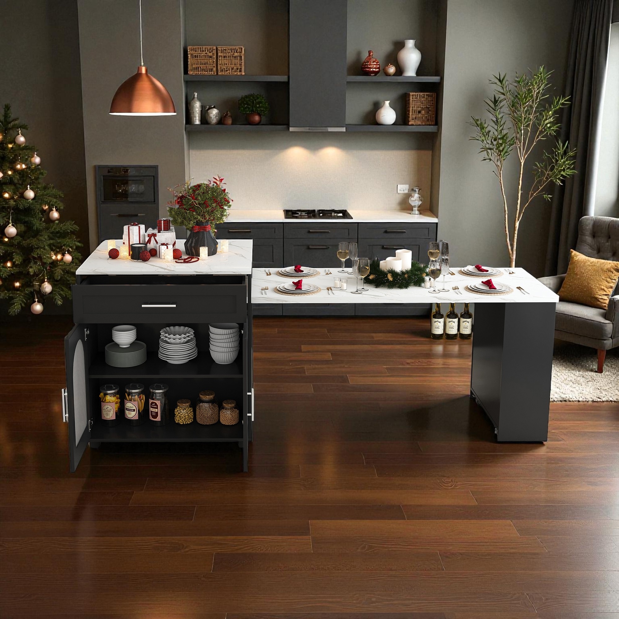 80" Expandable Kitchen Island with Dining Table, Mobile Storage Cart with Solid Wood Grain Top, Power Outlet, Cabinet & Drawers