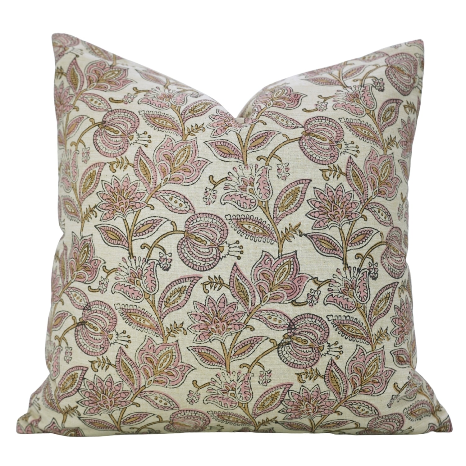 Fabdivine Linen Blend Handmade Block printed Floral Cushion Cover for Rustic Living or Bedroom 16x16 Inch, Custard Apple