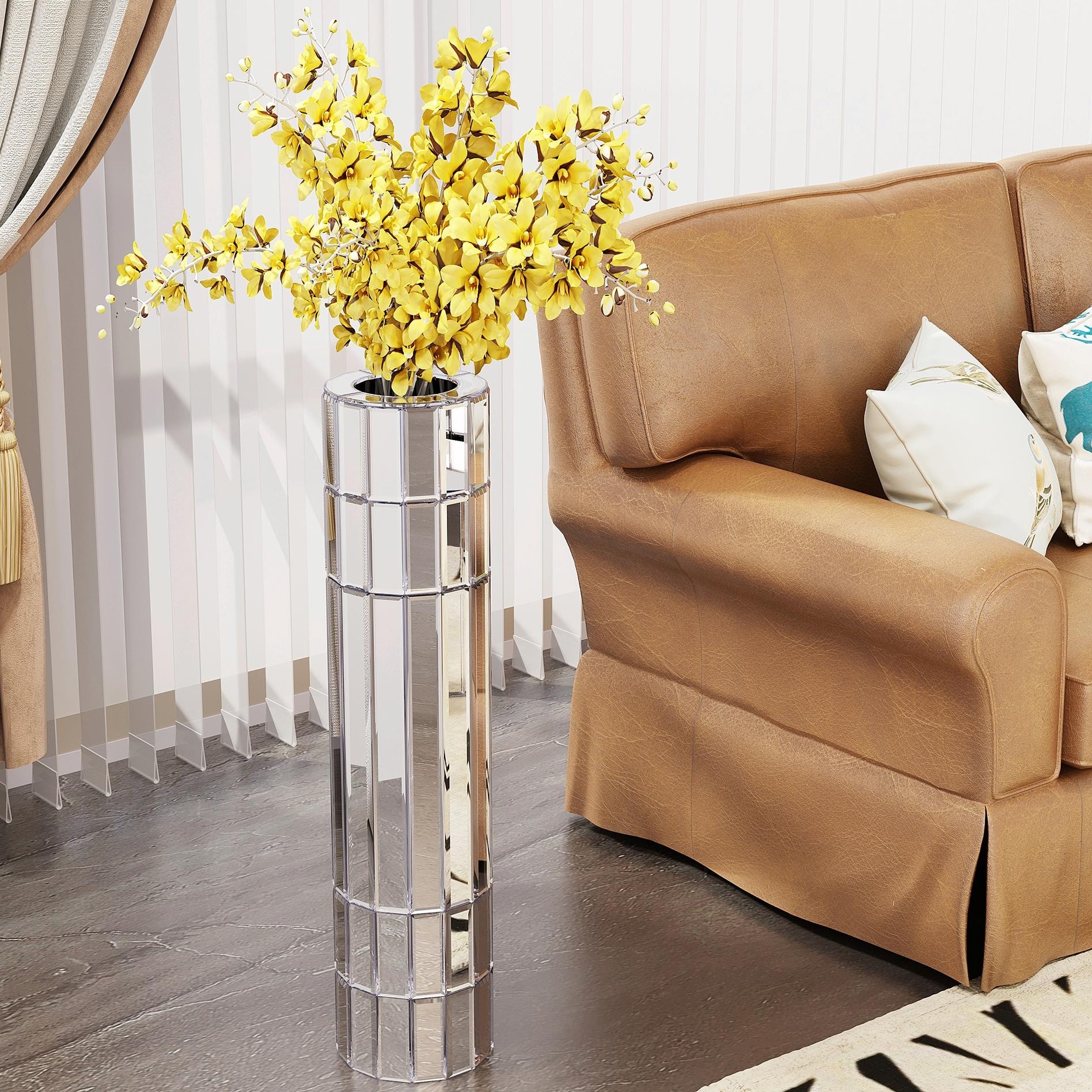 Tall Silver Mirrored Floor Vase for Home Decor, Round Mirror Panel Decorative Vase