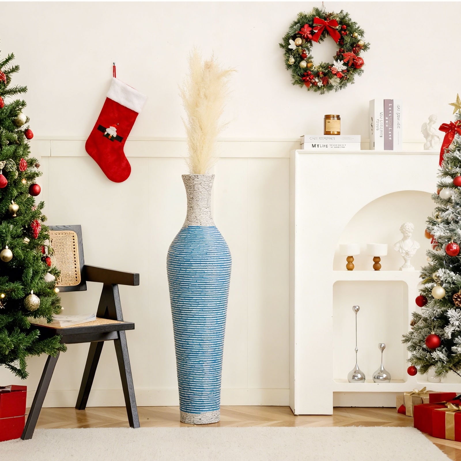 39" Hand-Woven Blue & White Striped PVC Rattan Floor Vase, Farmhouse Coastal Living Room Decor