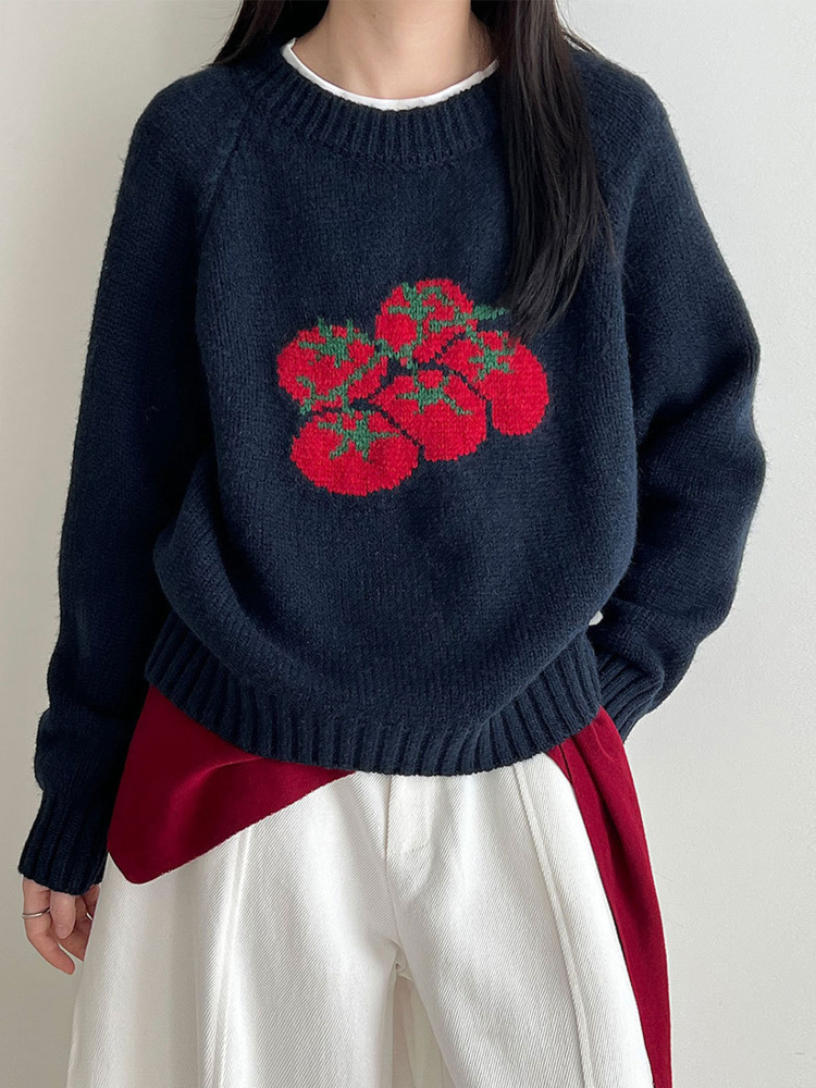 Autumn New Soft Pullover, Tomato Pattern Knitted Sweater, Loose Round Neck gray one Size