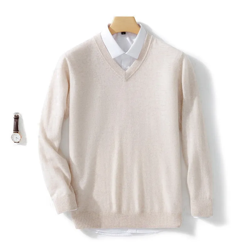 Mens Soft Cashmere Sweater, Autumn Winter Pullover Slim Fit V Neck Knitted Woolen Knitwear For Business Casual Wear apricot l