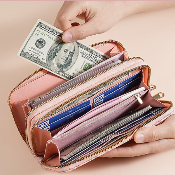 Double Zipper Wallet For Women And Men Stylish Long Coin Purse Cards Holder Wristlet Clutch And Money Bag pink