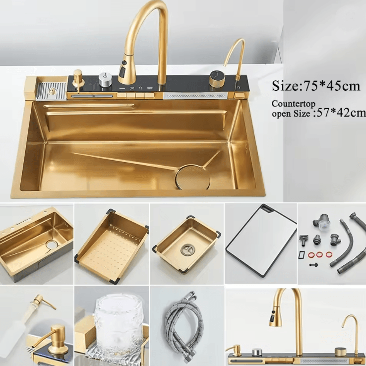 Smart Waterfall Workstation Sink With Digital Display brush Gold A 75x45cm