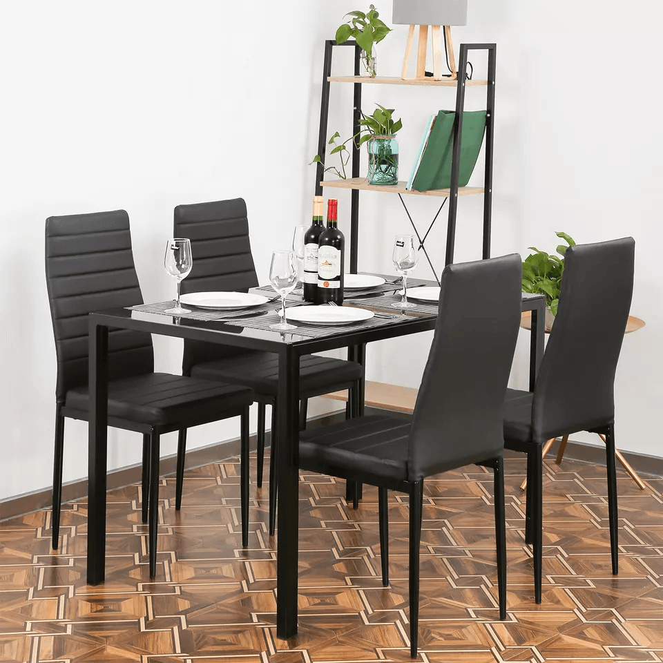 Modern 5 Piece Dining Room Table Set With Faux Leather Chairs, Glass Kitchen Table & Metal Frame Modern 5 Piece Dining Room Table Set With Faux Leather Chairs, Glass Kitchen Table & Metal Frame