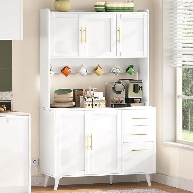 Modern Kitchen Pantry Cabinet With Microwave Shelf & Charging Station, Tall Floor Cupboard With Storage Drawers white