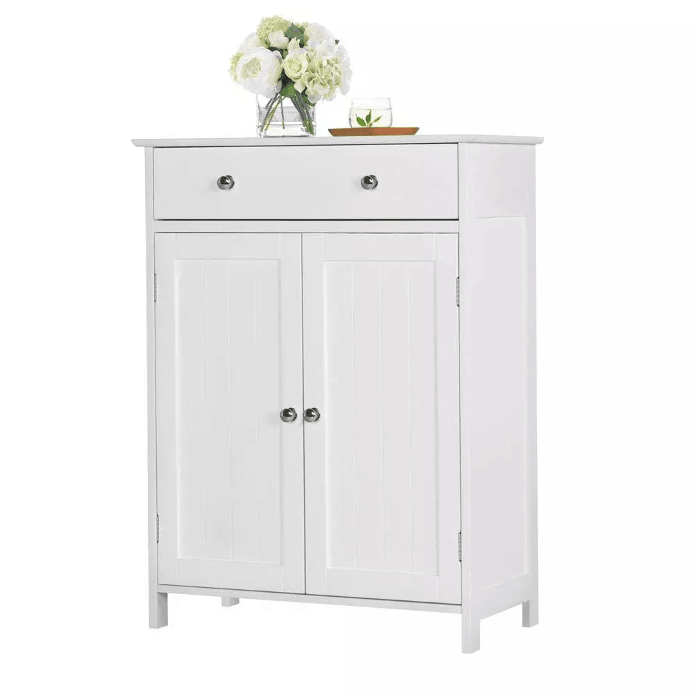 Freestanding White Wooden Storage Cupboard With Double Doors & Shelves, Bathroom Floor Cabinet For Kitchen, Living Room Freestanding White Wooden Storage Cupboard With Double Doors & Shelves, Bathroom Floor Cabinet For Kitchen, Living Room