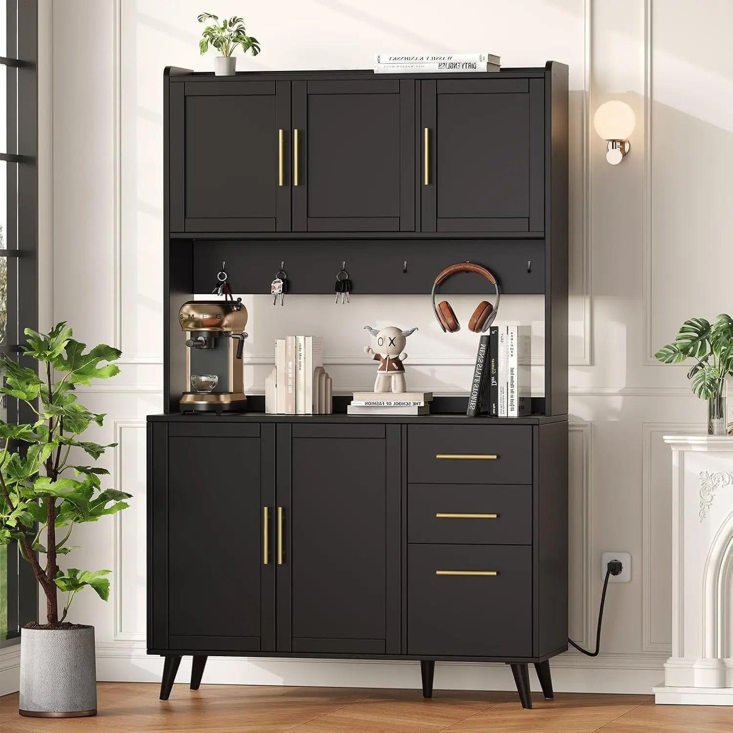 Modern Kitchen Pantry Cabinet With Microwave Shelf & Charging Station, Tall Floor Cupboard With Storage Drawers black