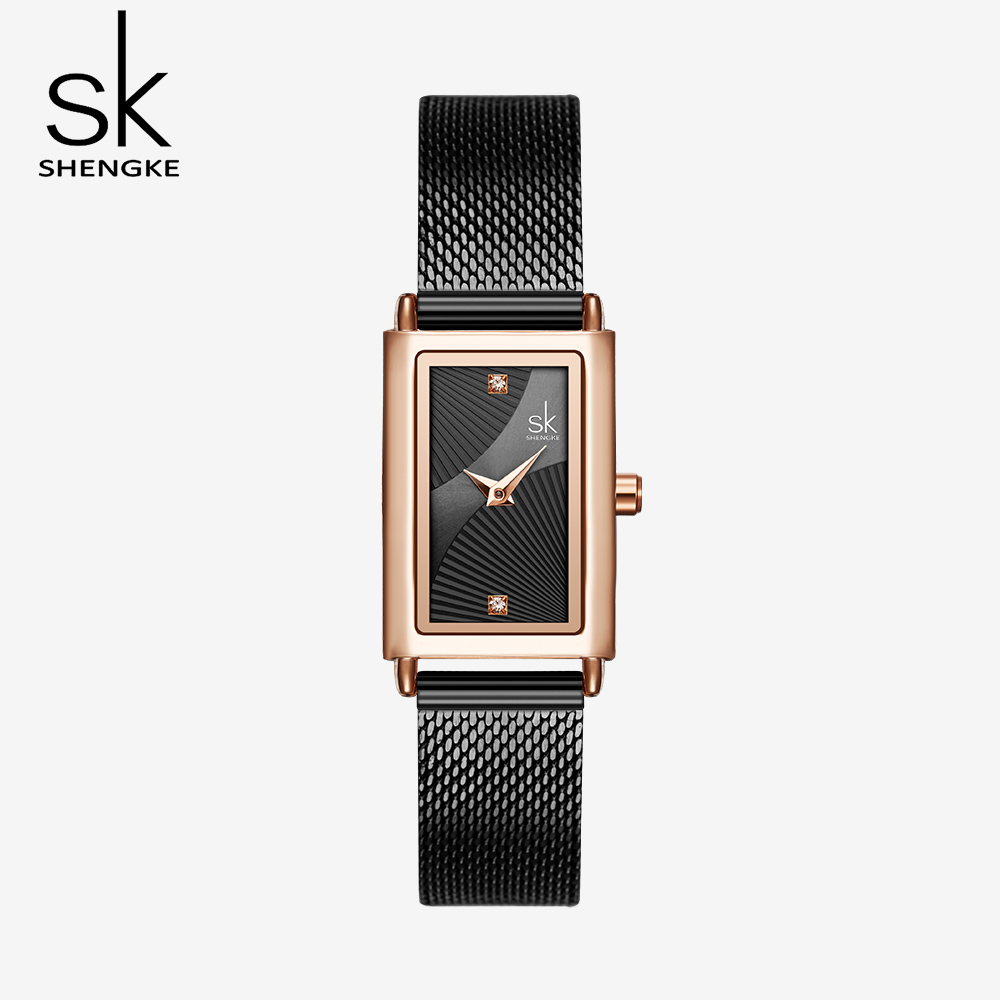 Delicate Rectangle Dial Gold Slim Watch For Women, Mesh Strap Waterproof Quartz Women's Elegant Timepiece mesh Black