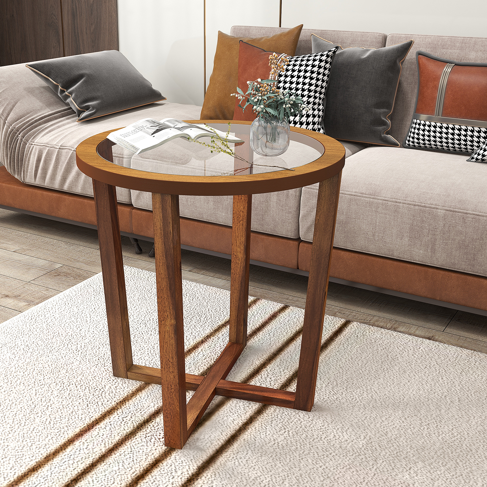 23.5 Inch Round End Side Table With Tempered Glass Tabletop, Modern Small Coffee Table With Rubber Wood Frame For Room 23.5 Inch Round End Side Table With Tempered Glass Tabletop, Modern Small Coffee Table With Rubber Wood Frame For Room