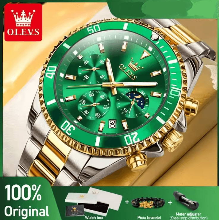 OLEVS Luxury Mens Watch Stainless Steel Chronograph Waterproof With Moon Phase gold Blue